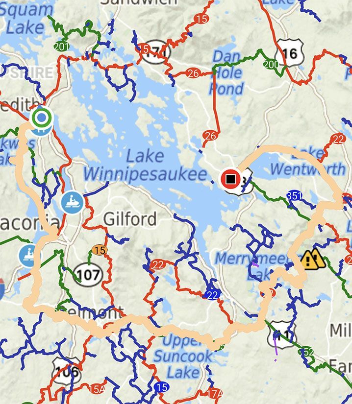 Circling back to the railroad tracks, I topped off the gas tank in Ashland before the final leg of the journey. The sky over Waukewan never disappoints.