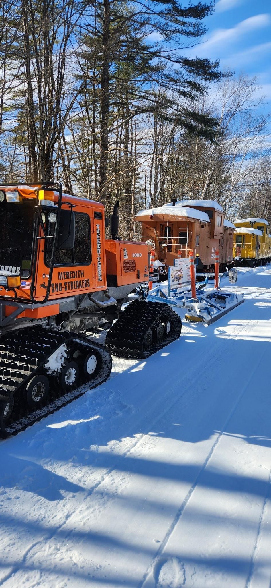 We picked up 3-ish inches of snow on Saturday. Tucker was out yesterday grooming the railbed, 15 up towards Moultonborough, and to The Mug restaurant. The massive snowdrift on the tracks has been dealt with as best as it can be as well.